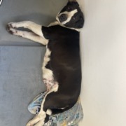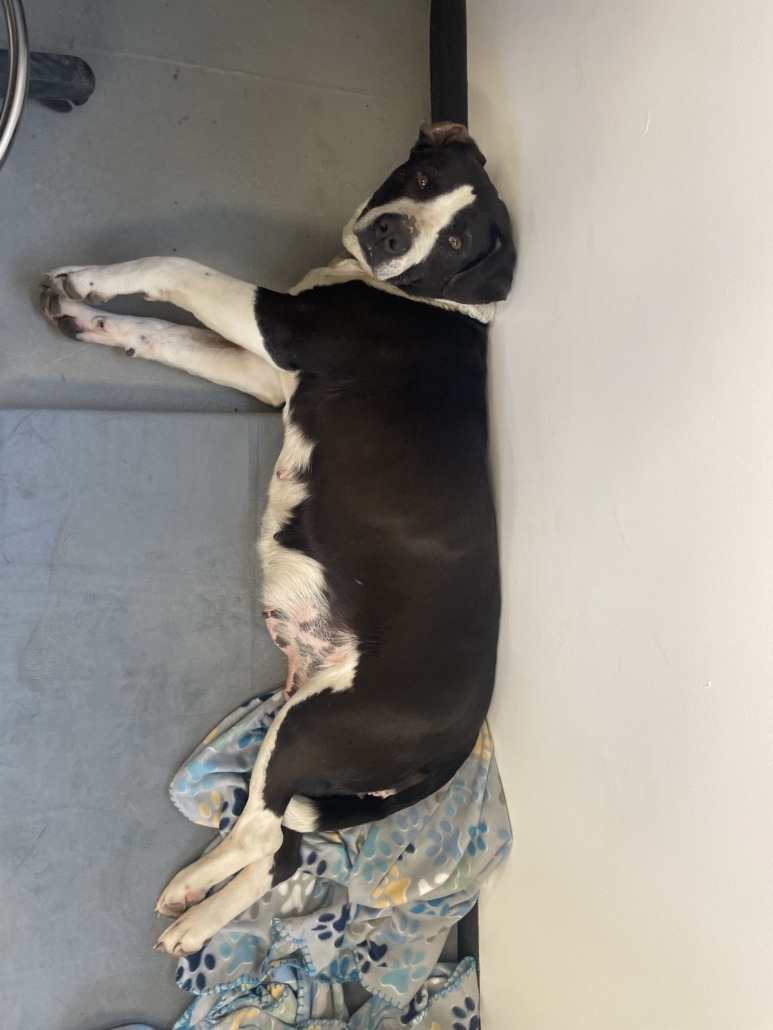 She has an injured back leg & is either pregnant or very recently given birth. She had a choke collar on and is very sweet. Looks like a Pit/Lab mix maybe?