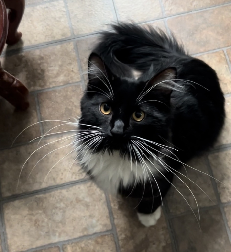 In tact male, long hair tuxedo, orange eyes, super friendly. He looks very clean so possibly hasn’t been outside long. Proof of ownership required.