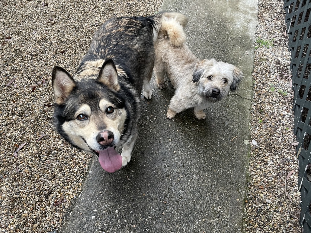 Two sweet dogs that appear to be inseparable. They have collars but no tags. One was chipped but the number wasn’t registered with the vet so they couldn’t give us any further direction. One appears to be a husky/shepherd mix and the other a smaller mixed breed dog.