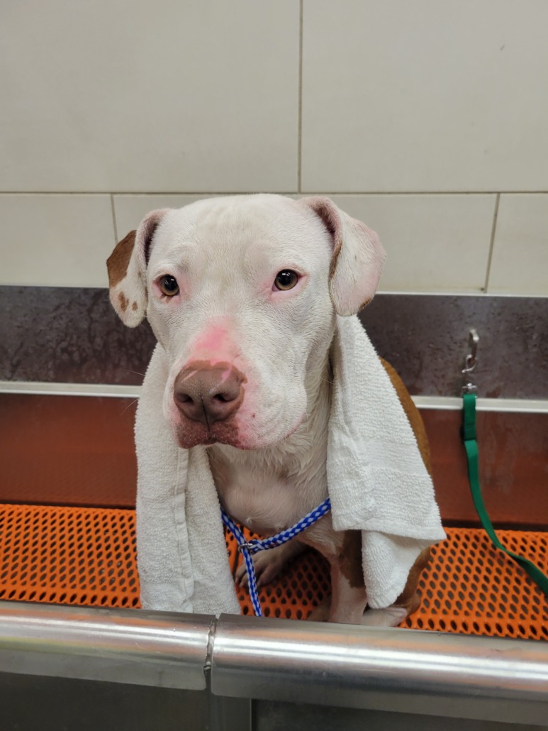 Brown and white female pit found. Has no chip and no collar. Very sweet.