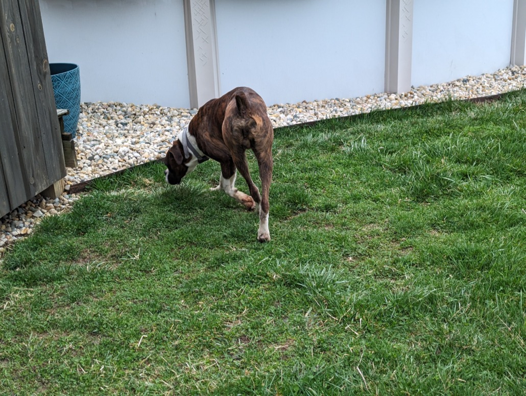 Brindle with white socks and neck area. Definitely a puppy. Found with doggy friend.