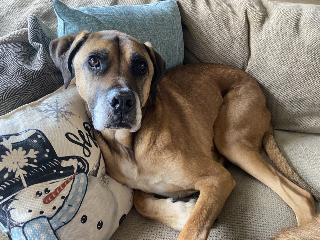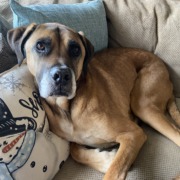 He is a tan dog with black on his face. He is a boxer/mastiff mix.