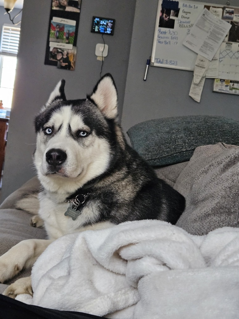 Has blue eyes black white and tan with a silver chain collar with his name I believe on it and an address which might be outdated