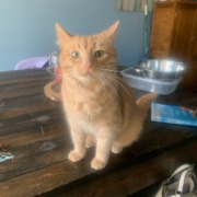 ORANGE CAT WITH GREEN EYES, VERY FRIENDLY,FLUFFY AND WILL COME UP TO ANYONE AND LOVE ON THEM