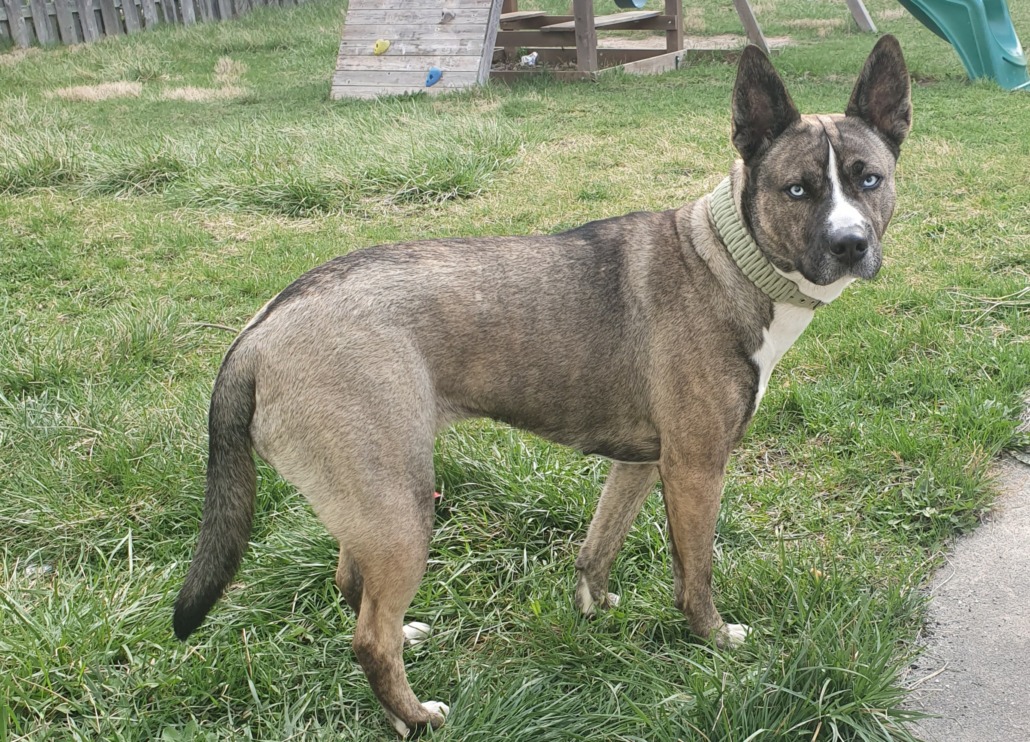 Well tempered, young, has a green collar. Bright silver-blue eyes, mostly brindle coat. White striped nose, white neck and chest
