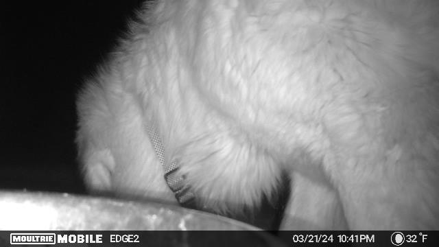 Large dog with a collar spotted at a community cat feeding station trail cam