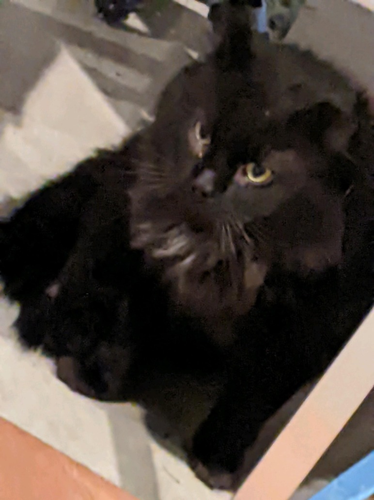 Black cat, long hair, seems to be full grown/ adult. Has been hanging out with my barn cats off and on for a few weeks.