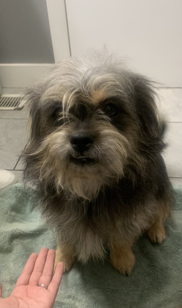 Black and brown. Has an underbite. Loves food/treats and squeaky toys.