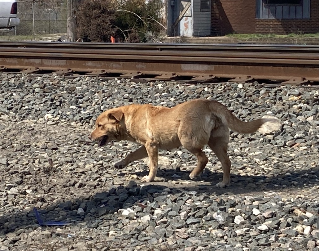 Female golden mix dog, running in street and along tracks near Massachusetts and North Sherman.