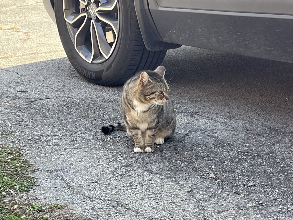 Grey/light brown tabby with white front paws and white rear legs. Very vocal. Won’t allow close contact but follows us around as we are outdoors.