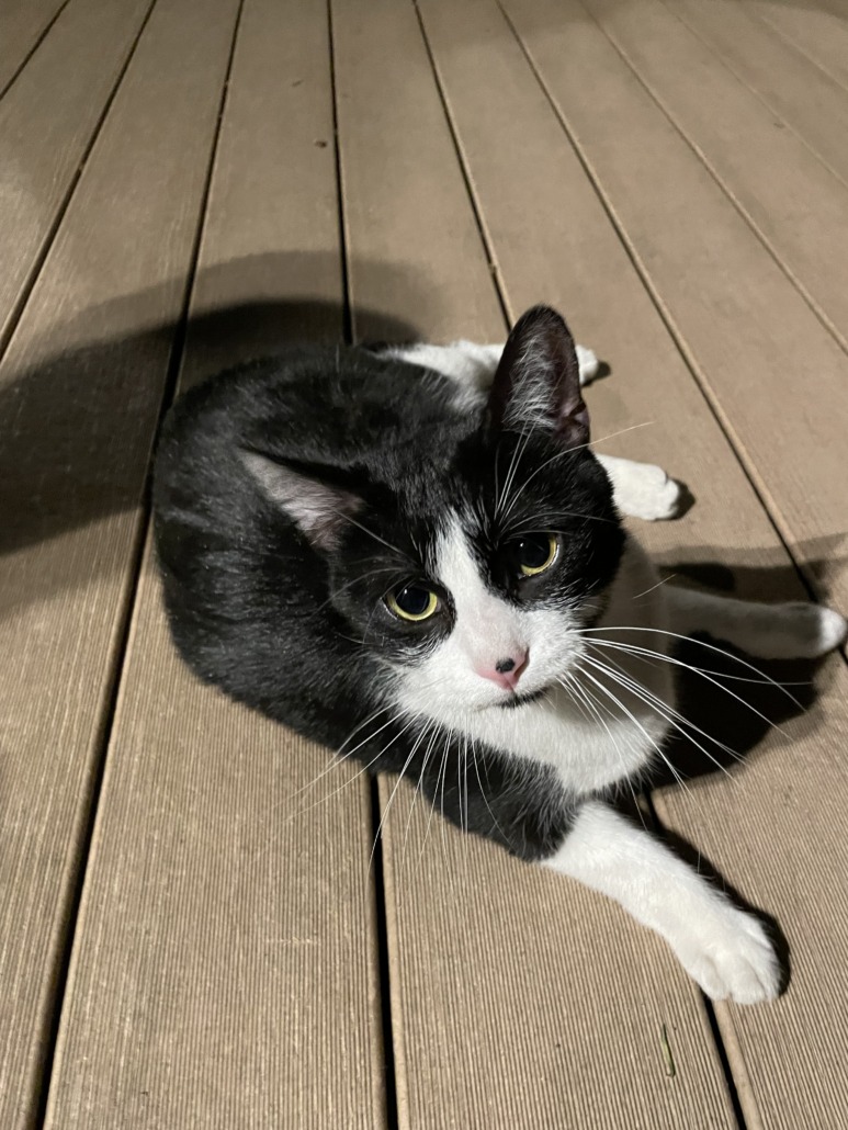 Black and white male cat. He’s very vocal, he’s lost, wants to come inside. I have located a chip but the owners are not responding – maybe the phone number wasn’t updated. He’s been here for 12 hours trying to get in.