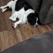 Max is an Australian shepherd that is mostly white and black. He has some brown coloring on his legs.