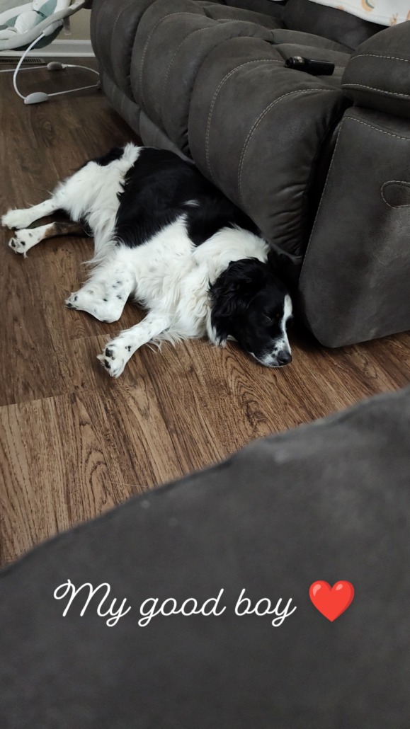 Max is an Australian shepherd that is mostly white and black. He has some brown coloring on his legs.