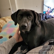 Resembles a black lab with shorter legs. Slightly overweight, all black. Collar with pink skulls