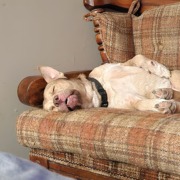 Large Pitsky tan with dark brown accents. Very nervous, loves people.