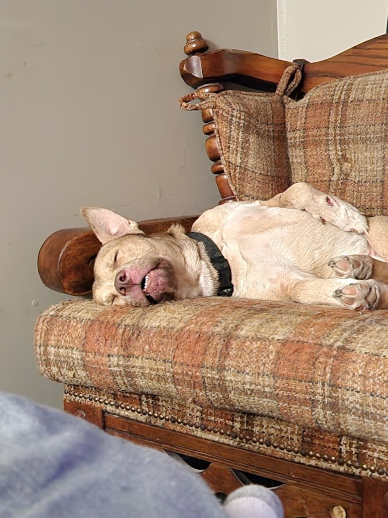 Large Pitsky tan with dark brown accents. Very nervous, loves people.