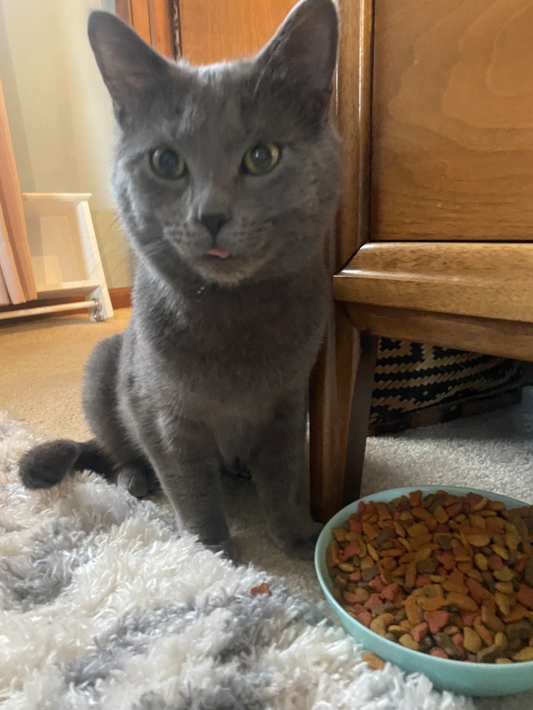 Gray male. Very vocal and sweet. He’s currently at my home. Appears not to be fixed, but I’m not an expert on that. He’s very affectionate