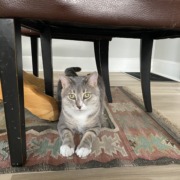 Shes a grey tabby, very skiddish. She has a blue collar on but no identification nor microchipped. She fell through the window screen of a window. I have seen her a little on the camera but she’s not coming back as often as the first time she got out 🙁