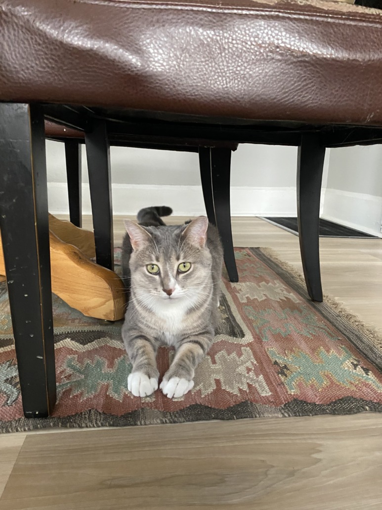 Shes a grey tabby, very skiddish. She has a blue collar on but no identification nor microchipped. She fell through the window screen of a window. I have seen her a little on the camera but she’s not coming back as often as the first time she got out 🙁