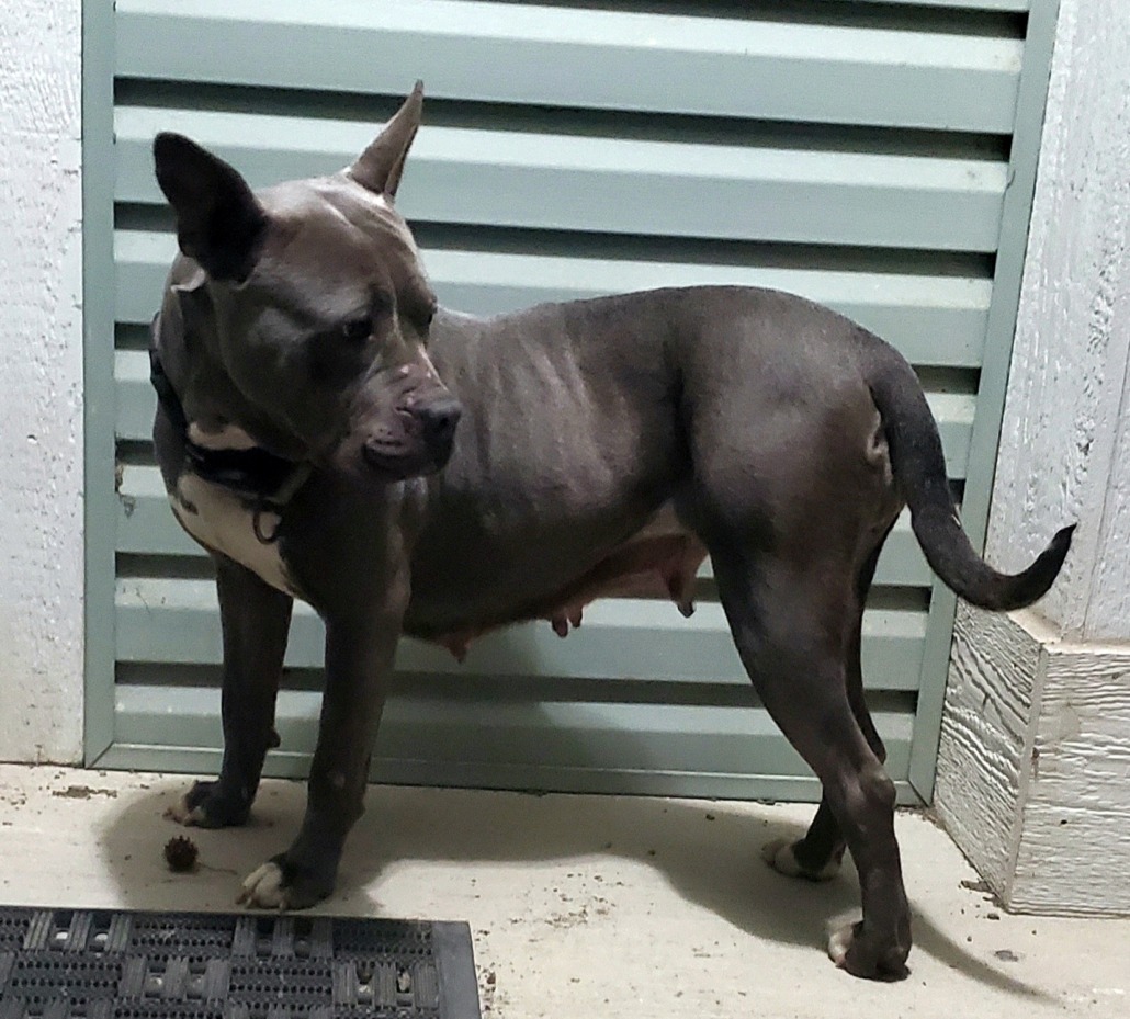 Grey with white chest. Recently gave birth I assume.