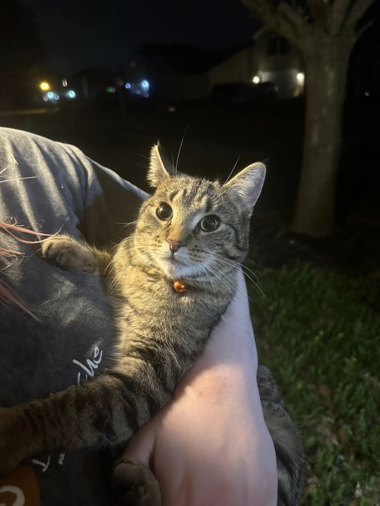 Brown and black tabby. Slight orange tint to the belly. I think the cat is a neutered male, but I can’t be sure. He was very unwilling to let me get a look. Medium-large cat (more on the medium side, but I can’t be sure how much he weighed). Orange collar with a white stripe and an orange bell. Yellow eyes with a think blue ring around the pupil.