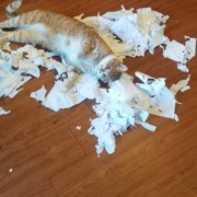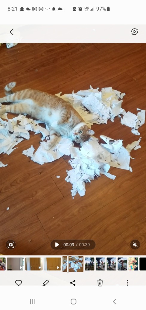 Large orange and white cat. He is very friendly and very vocal. He has green eyes and he is fixed with a clipped ear. He has white on his chest face neck stomach and paws. And dark orange stripes. And a dark orange M shape on his forehead.