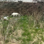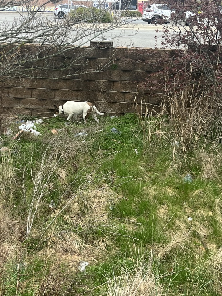 White with brown areas. Looks to have an electric collar. Seems sweet but very scared. He/she wanted to come but it came at me a bit to scare me off. It kept going south on the Monon from 86th st between Kroger and Notch at Nora. It just kept going away from me. Tried to lure him/her.