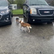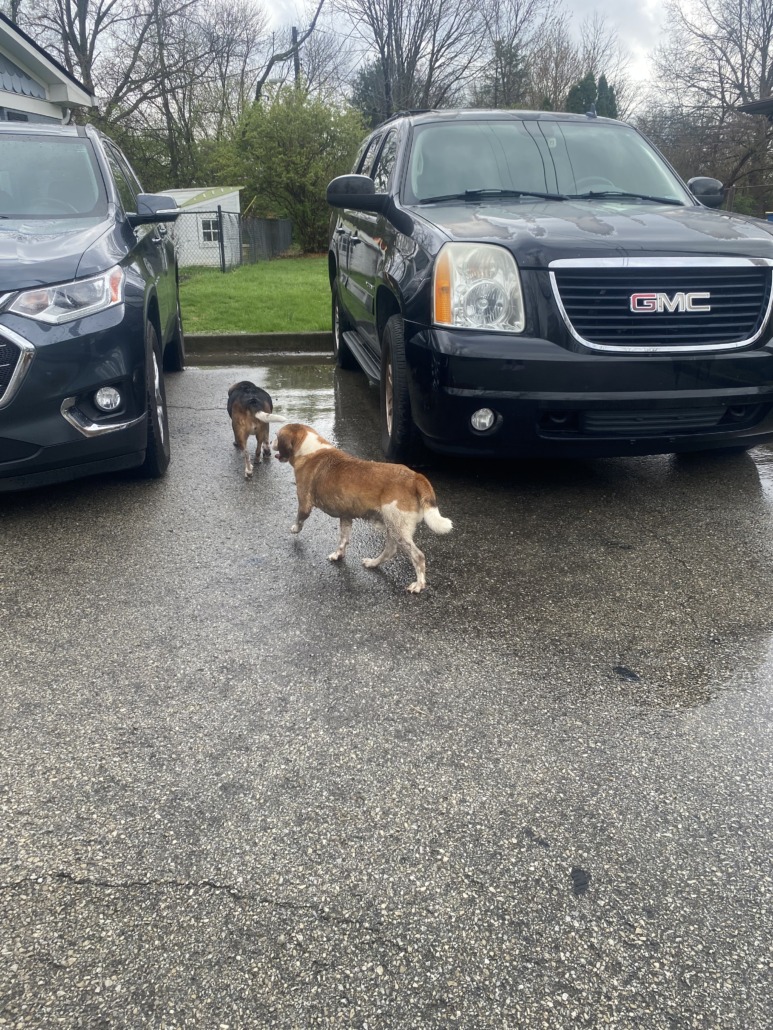 Two beagles. Appeared to have been out in the rain earlier and were dirty. Very sweet. No collars.