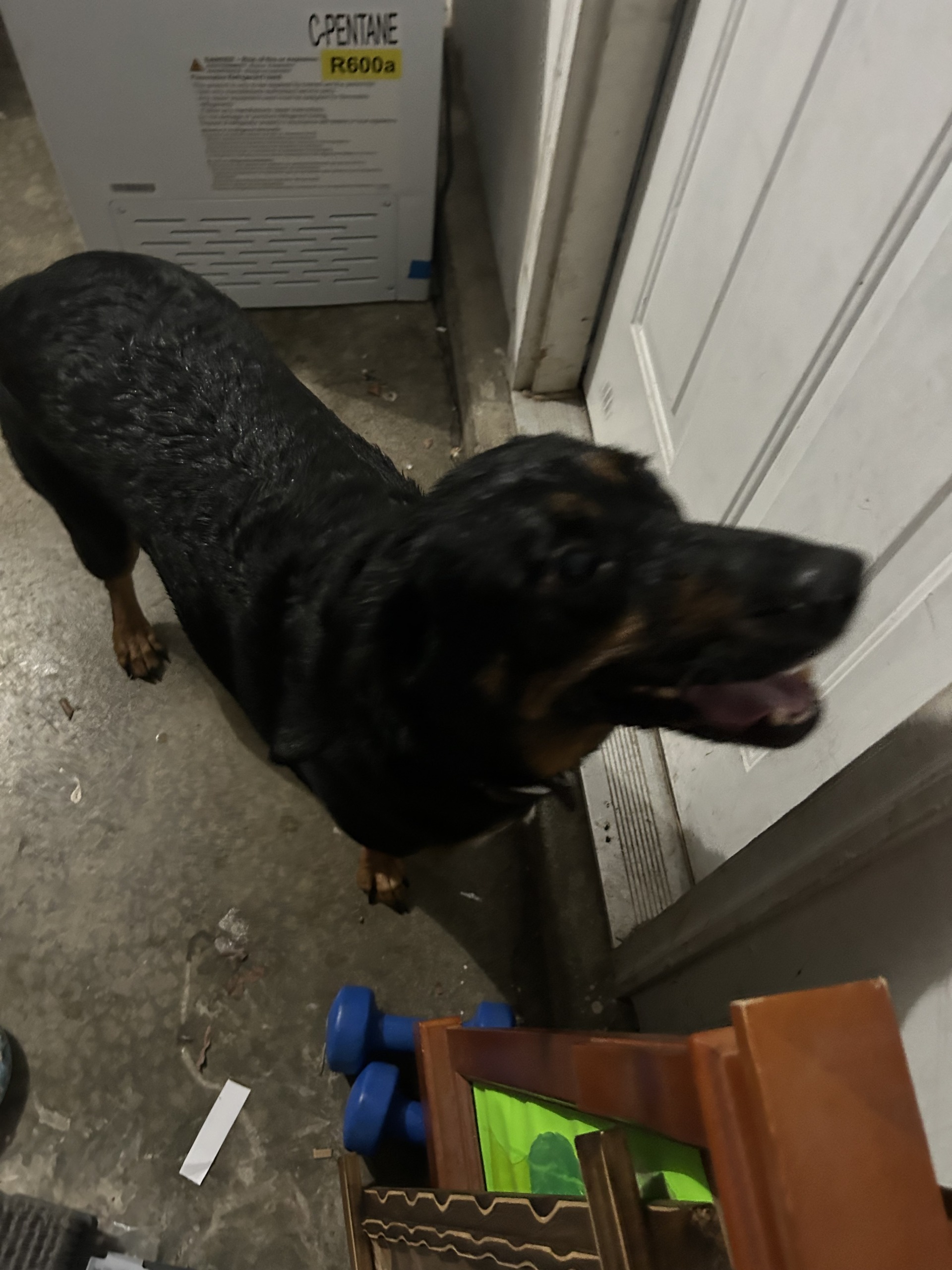 Large female dog. Mostly black with some brown. Brown collar with little silver bones. No tags. Seems sweet just jumped right into car.