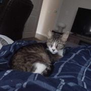 Brown and white with green eyes, older. Knicks in left ear. Very sociable. Registered emotional support animal