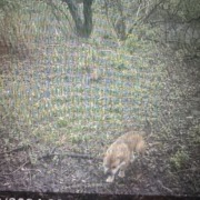 Light brown with white muzzle and some white on paws. It has floppy ears. One of the rear paws is injured and the dog is limping. It’s been hanging out in the brush north of Buffalo Creek. It won’t approach humans but it has eaten food left out for it. Photos taken by a neighbors trail camera.