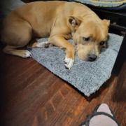 Medium size female dog. Really don’t know breed,she looks a little like a pit bull. She followed my husband and my male dog home while my they were out taking a walk.