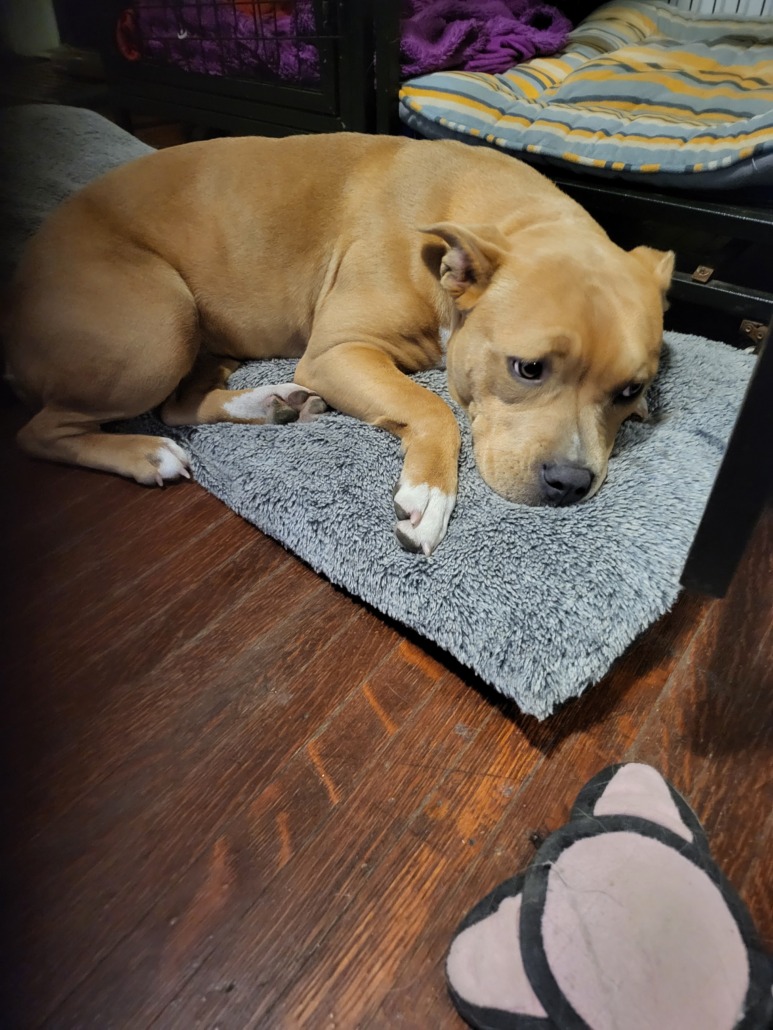 Medium size female dog. Really don’t know breed,she looks a little like a pit bull. She followed my husband and my male dog home while my they were out taking a walk.