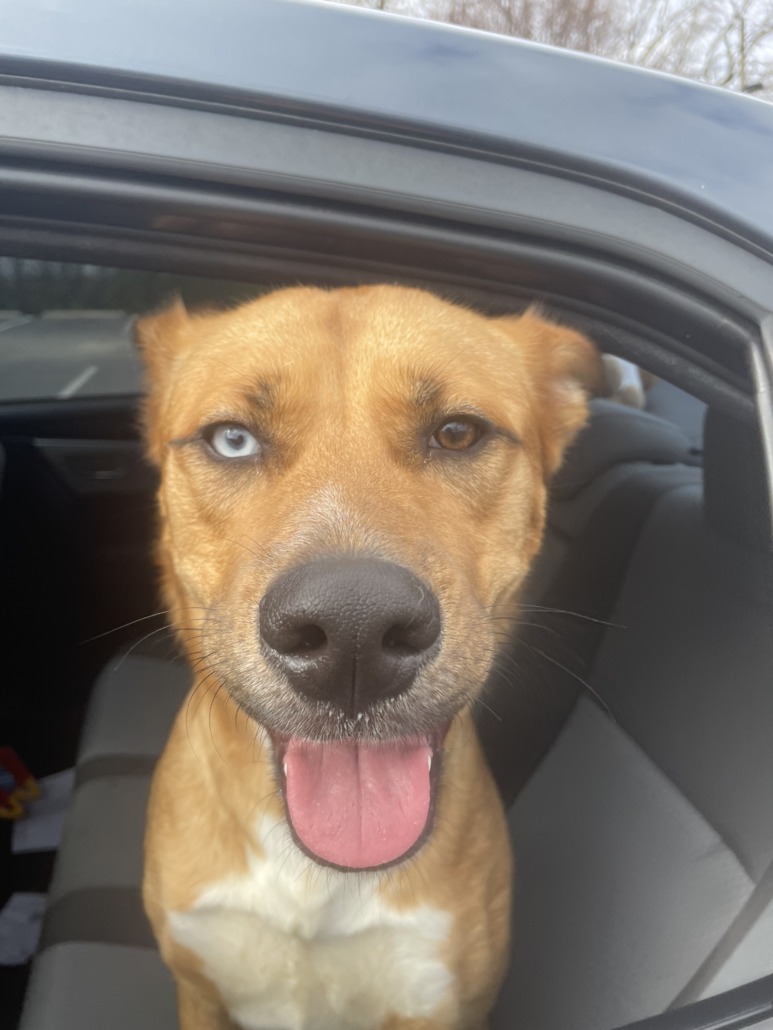 Large male brown dog with black spots on back of head and one ear. white on chest.