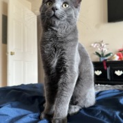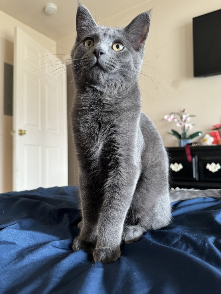 Short hair grey male. 5 months old. Green eyes.