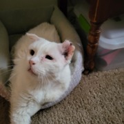 Approximately 8-10 years old. Amputated back right leg. Top of left ear is disfigured & has a scab on it. He’s been sick with upper respitory infection so needs his meds. Had a tooth pulled on 4/4/24 & still has some dried blood on his snout that I haven’t been able to get all cleaned off yet. Can move pretty quickly despite only having 3 legs. May look somewhat emaciated because he’s had trouble eating with his upper respitory infection so he lost a few pounds.
