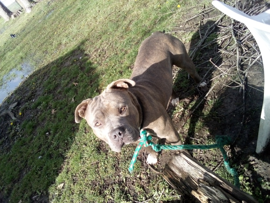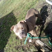 He is a blueish/grey and brown brindle, with white on his chest and paws. He weighs approximately 70-80 lbs. Very friendly. He has a raspy kind of bark. He is 4 year old little girls dog. He went missing April 6th around 10am.