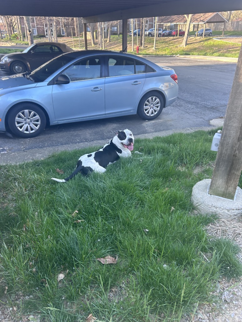 Large white pitbull with black spots. Seems to have an injured front paw.