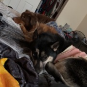 Female husky. With a white and black coat. She has 1 brown eye and 1 blue eye
