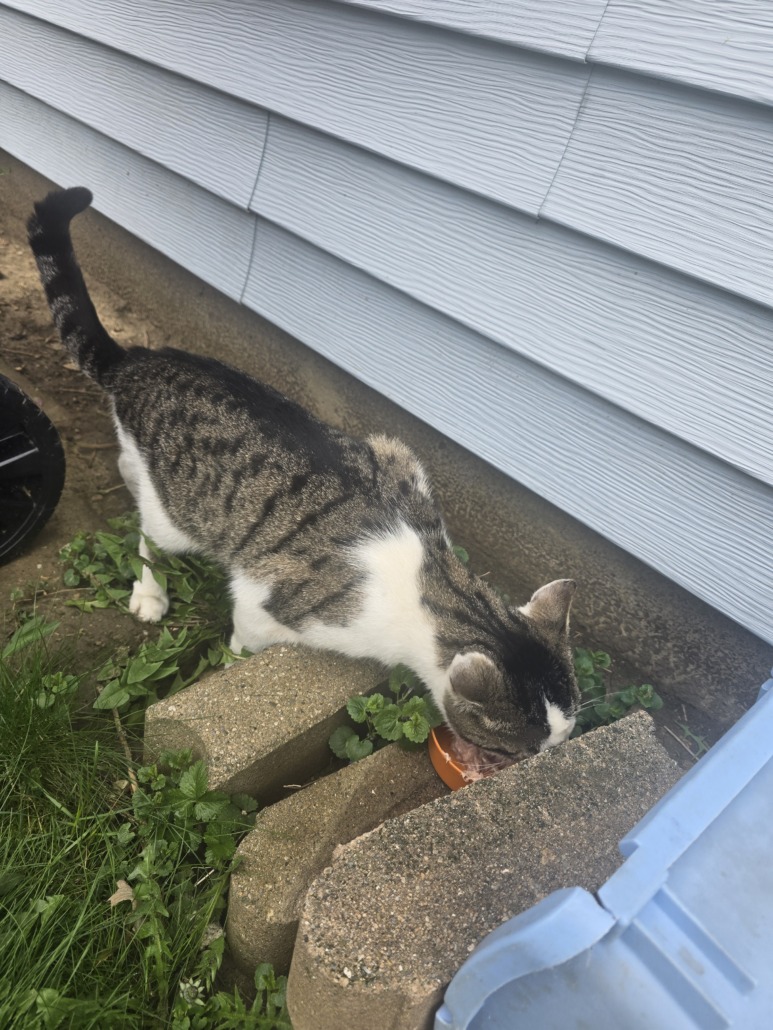 He is a young male. Very friendly and seems cared for. He is white and tabby/spotted. Proof of ownership is required.