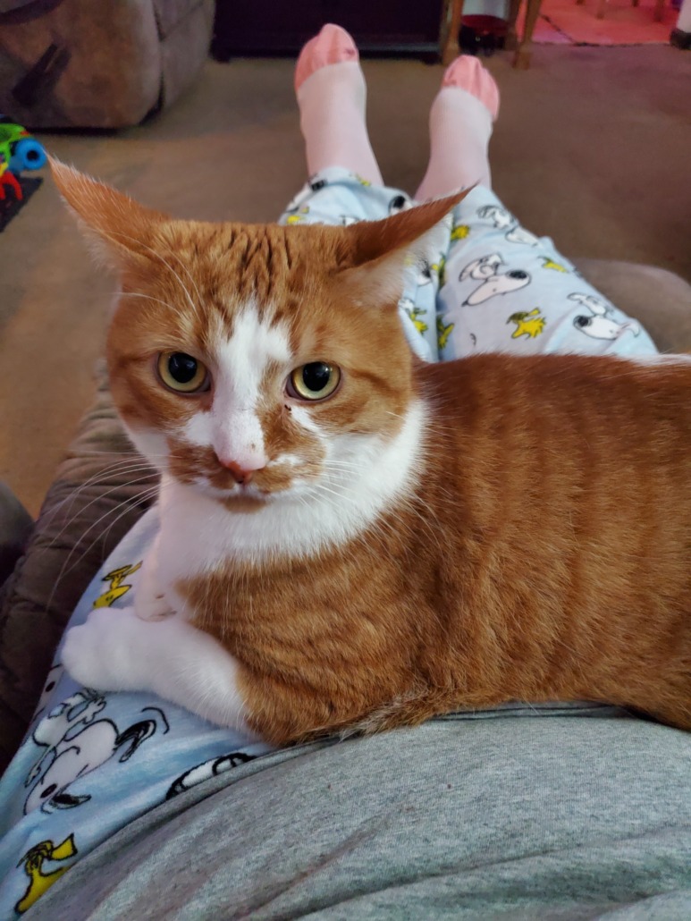 Orange and white tabby cat. He has orange spots on his nose and a white spot in the middle of his back and he’s big. Large frame, maybe close to 20 lbs. He’s wearing a collar, probably blue and orange.