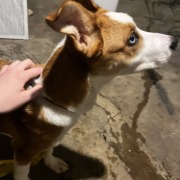 Primarily red and white. Light blue eyes. Appears to be very young, around 6 months is my best guess. Very friendly. Proof of ownership required.