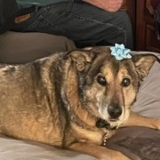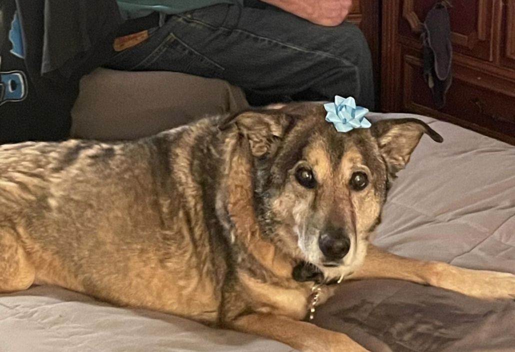 Elderly dog. He is mainly brown with a thick coat. He doesn’t see or hear very well. He is wearing a collar that has a tag. Medium size
