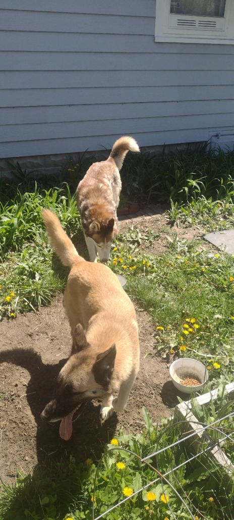 Found 2 dogs, a husky and a German Shepard. Husky is wearkig a red scarf.