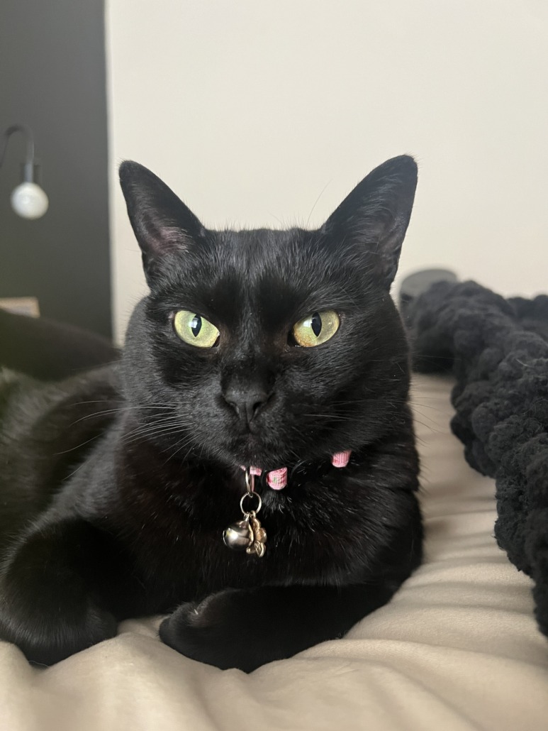 She is somewhat a dwarf, short legs, tiny with a belly. Pink collar with a bell. Green eyes. Shy but very sweet. May not come to you if called. Chipped. Has a very tiny white speck on her chest just below her collar that you may not see unless holding her, about the size of a pea.