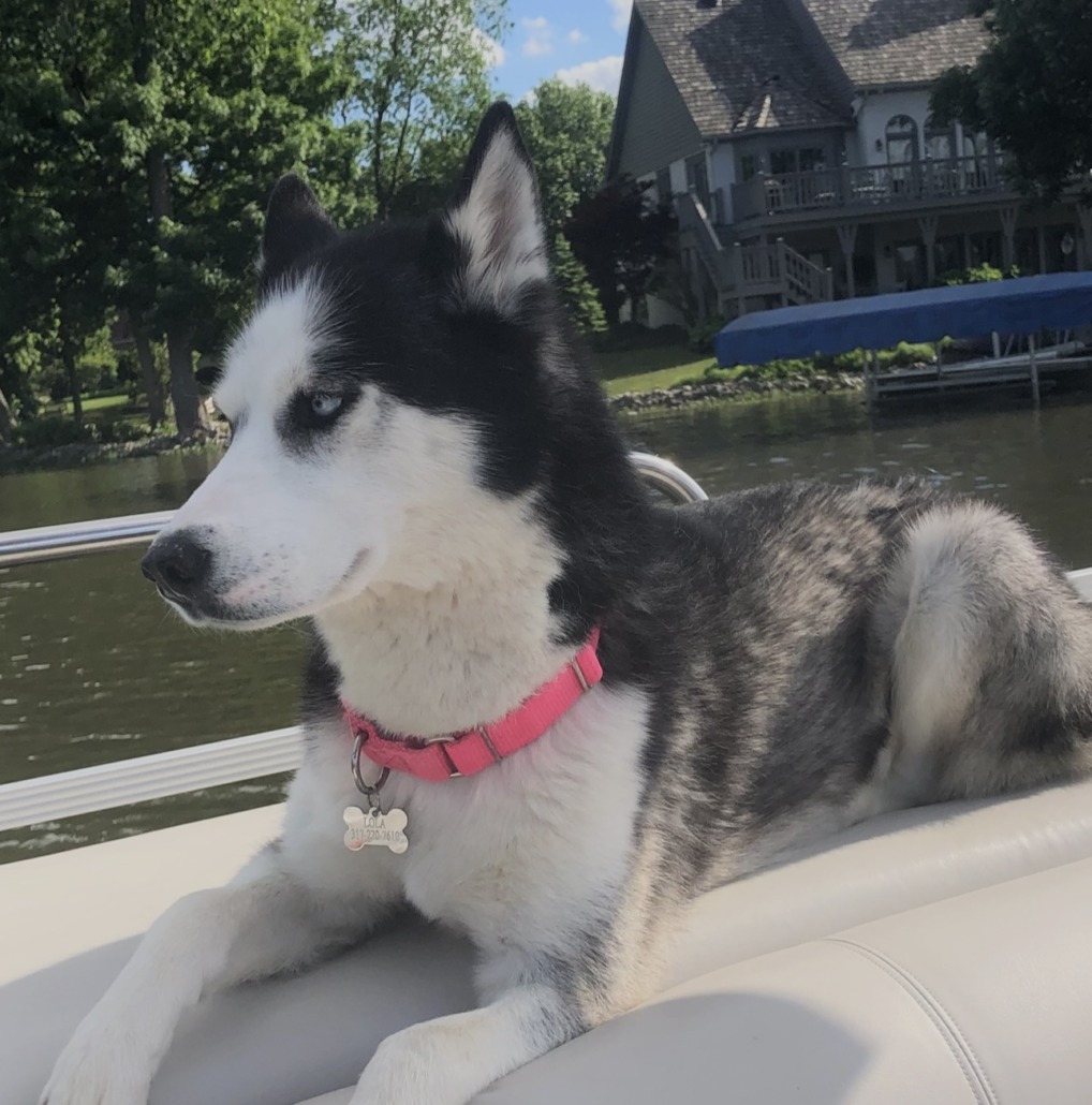 Female Husky. Black & White coloring. Blue eyes. Pink collar.
