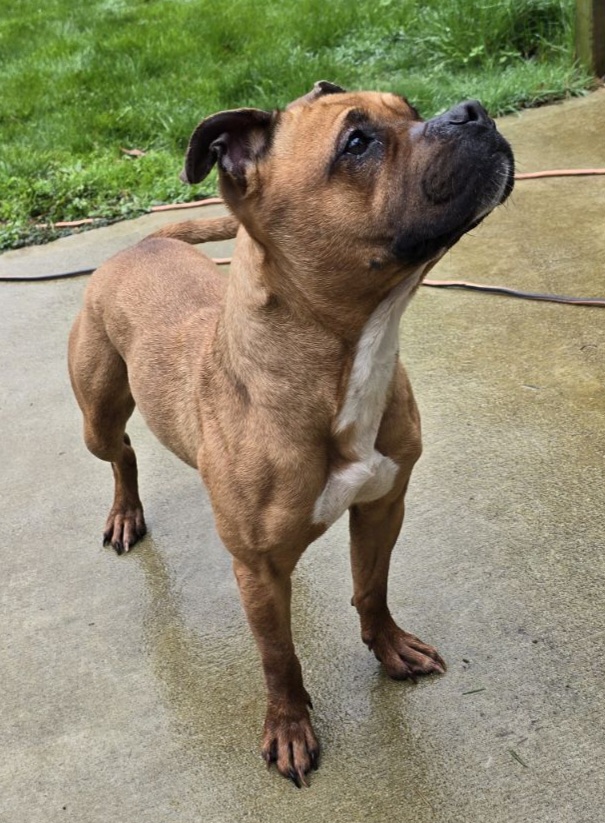 Medium sized brown dog with white on her chest and a black muzzle. Super sweet, loving and gentle. Was very skinny when we found her. Please show proof of ownership to claim.