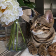Bangle , strips on legs, spots on belly and back, he has a black line down his spine. We miss him so much he’s been missing for a month. He doesn’t like to be held. He is fixed