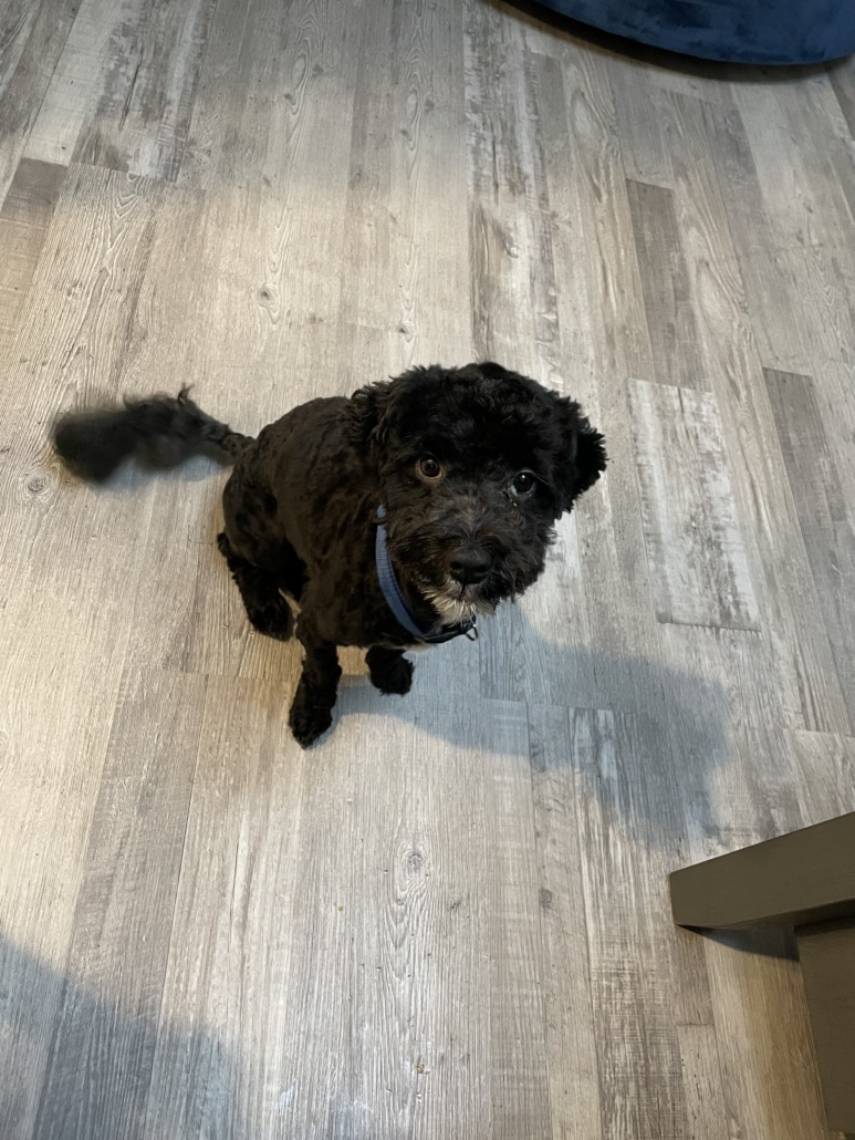 He’s all black goldendoodle with a small white strip of his chest. He’s about 15 lbs and has on a brown MCM collar. He’s very friendly