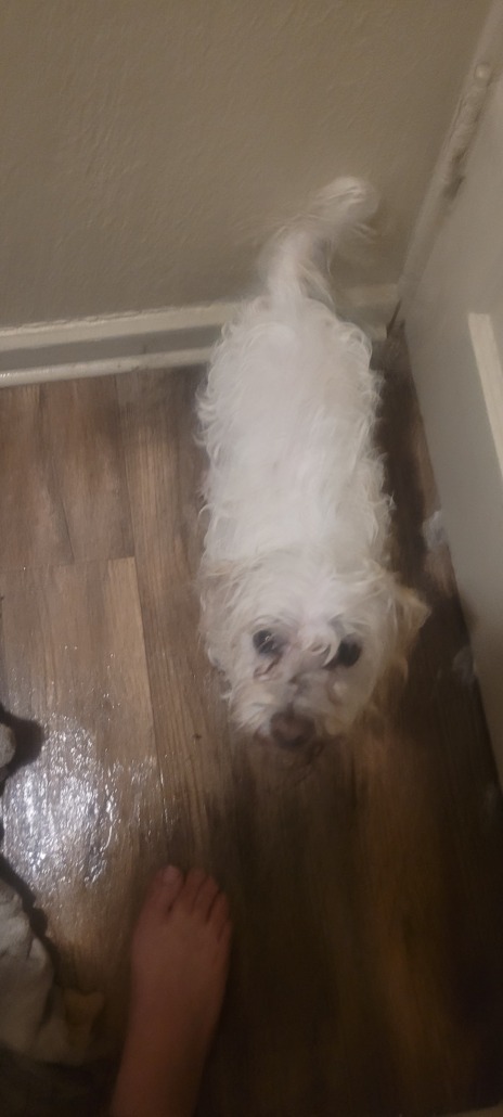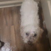 White, possibly maltese. Very friendly. Neighbor thought it was my dog and put him in my fence. Was covered in feces so I washed him. Proof of ownership required